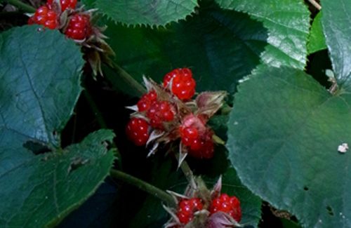 樹林と樹林の合間の明るいブッシュ帯にちょうど背丈ほどのキイチゴの類かと思われる灌木が薄紅色のきれいな花をつけて群生していた。思わず見とれてしまう、花盛りの大群生!